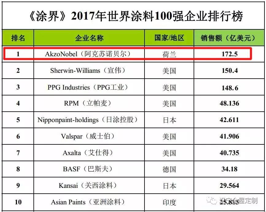 根据《涂界》发布的“2017年度世界十大涂料制造商排行榜”显示,阿克苏诺贝尔依然稳居世界涂料企业“一哥”宝座,再次彰显品质大牌的实力。