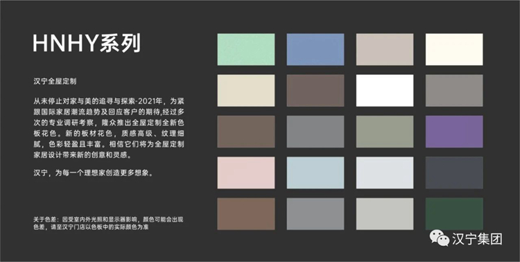 为接轨2021年国际家居潮流趋势,汉宁新引进几十款独家花色,继续沿袭高端全屋定制的标准,以优秀的设计审美视觉和良好感知触觉,展现天然原木、环保新实木产品高品质的审美诉求。