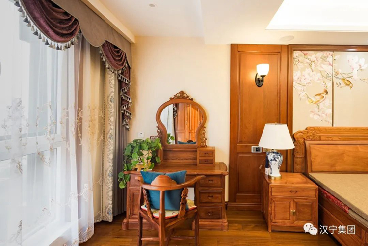 卧室里大窗户与暖黄的灯光,在昼夜交替间让居室阳光满溢,木质的家具在合理充足的采光和照明下,看起来温暖而舒适。